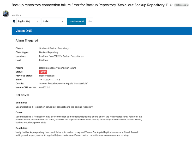 I cannot wait to test the integration with *ProxMox *9 and, at the moment, this funny thing happened: this morning I configured in *ONE *and alert to receive an email when a repository is unavailable (customer’s request to test). I didn’t work (no alert, no email).